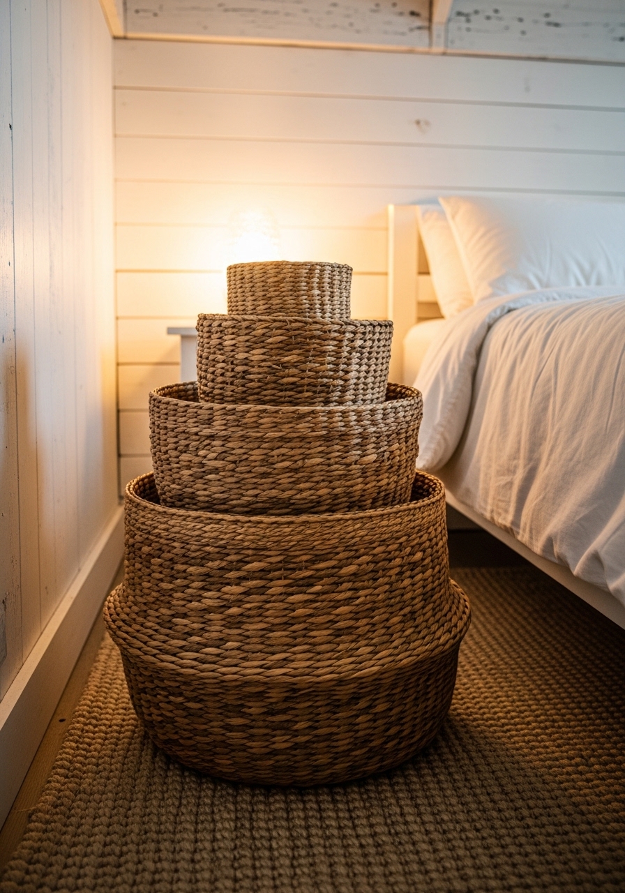 Incorporate woven baskets for bedside storage to hold books or throws, adding boho texture to your farmhouse bedroom. I use mine for extra blankets, and it hides the clutter so well – plus, they’re affordable at thrift stores. It brings that handmade warmth without any fuss.