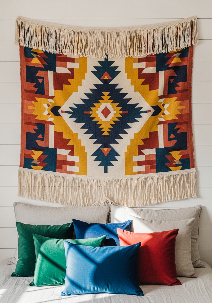Hang a textured tapestry as a headboard alternative for instant boho flair in your farmhouse bedroom. Mine is a thrift find with neutral patterns, and it softens the walls while adding personality – though I had to iron out a few wrinkles first. You can layer it with string lights for evenings.