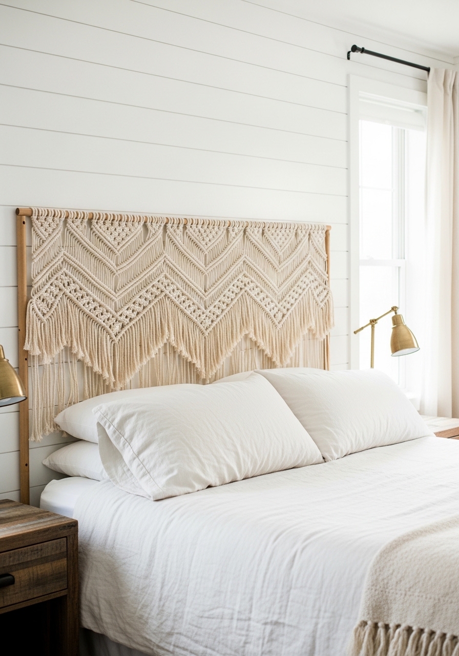 I’ve been loving the idea of a handmade macrame headboard to bring in that boho texture without overwhelming the farmhouse simplicity. Hang it low for a cozy feel, and layer with neutral pillows. It adds such a personal, artisanal touch that you can’t get from store-bought pieces.