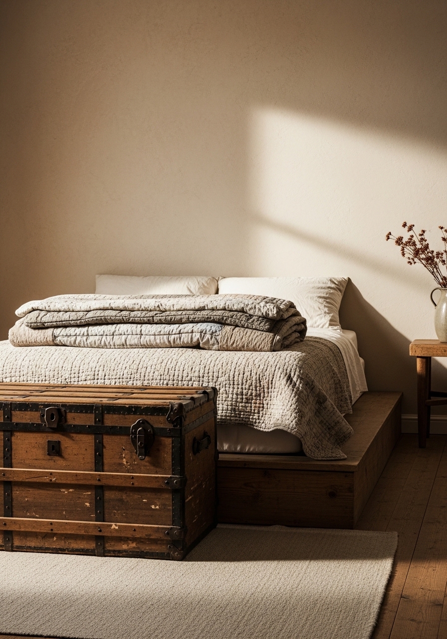 Placing an old trunk at the bed’s end for storage or seating brings in that authentic farmhouse history with boho potential – think stacking blankets inside. I found one at a flea market and it became my favorite piece. It adds character and hides extra linens perfectly.