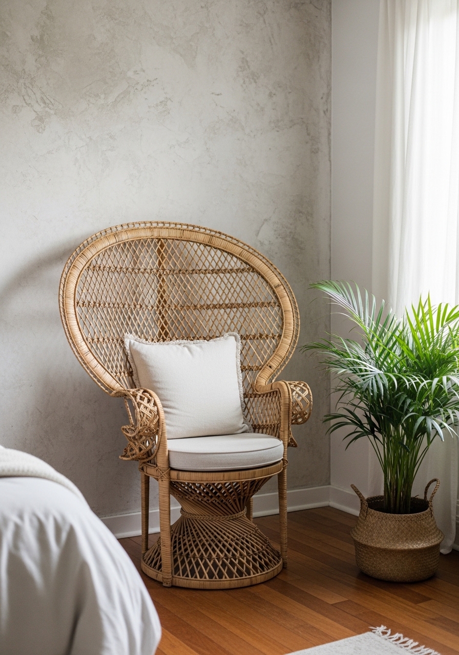 Adding a rattan chair in the corner provides a cozy reading spot that fits the boho farmhouse aesthetic perfectly. Drape a knit throw over it for texture. I curl up there with coffee, and it’s my little escape within the room.