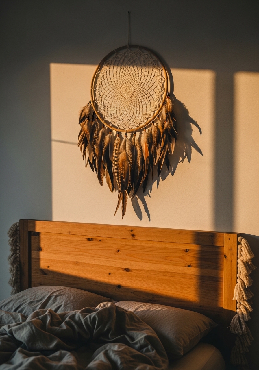 Incorporate a oversized dreamcatcher as a boho centerpiece above the bed for that spiritual, free-spirited energy. Pair it with soft lighting to enhance the magic. It’s one of those pieces that starts conversations and adds whimsy.