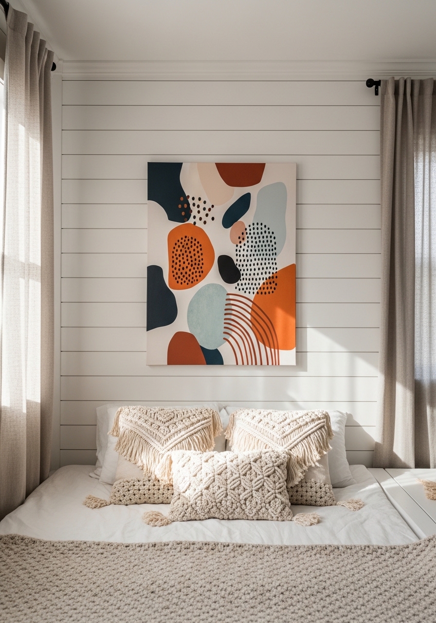 Install shiplap on one wall and hang boho-inspired art for a focal point that’s rustic yet artistic. Choose earthy tones to blend seamlessly. It gives depth without cluttering the room.