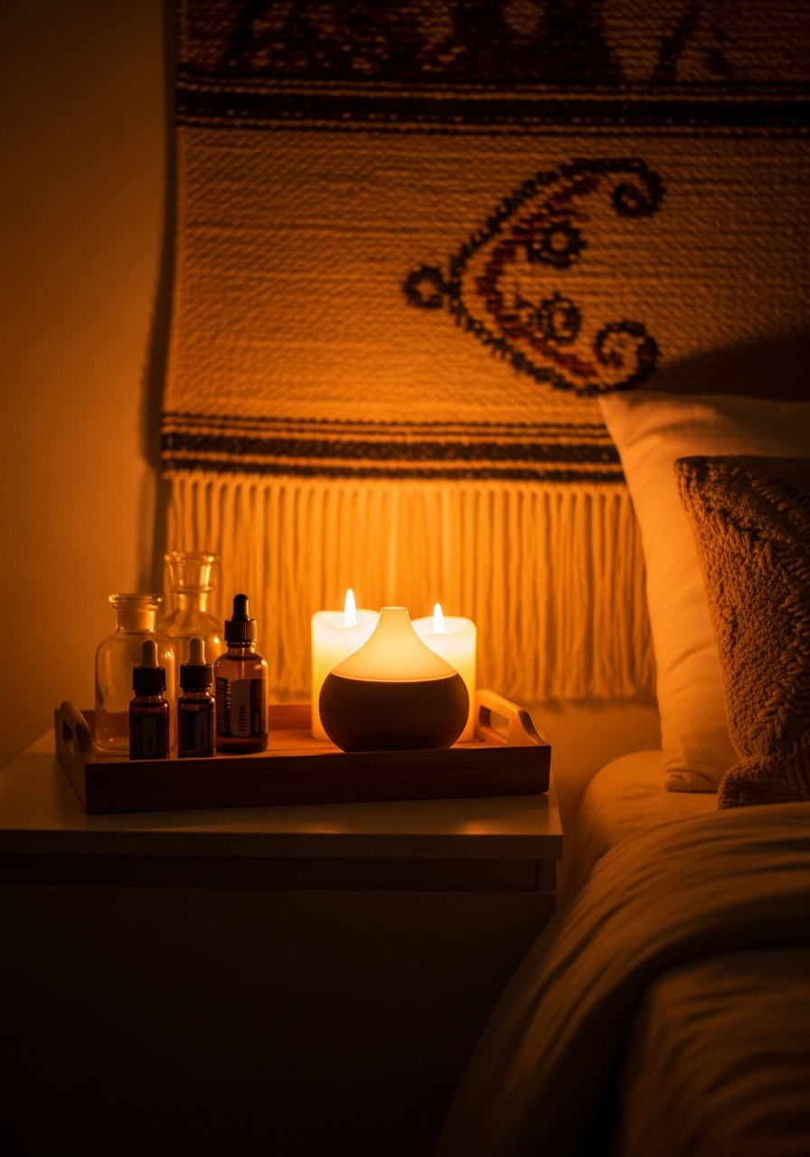 Set up a small essential oil station on your nightstand for calming scents that enhance the boho vibe. Lavender and eucalyptus pair well with farmhouse woods. It’s a subtle way to make your bedroom a wellness haven.