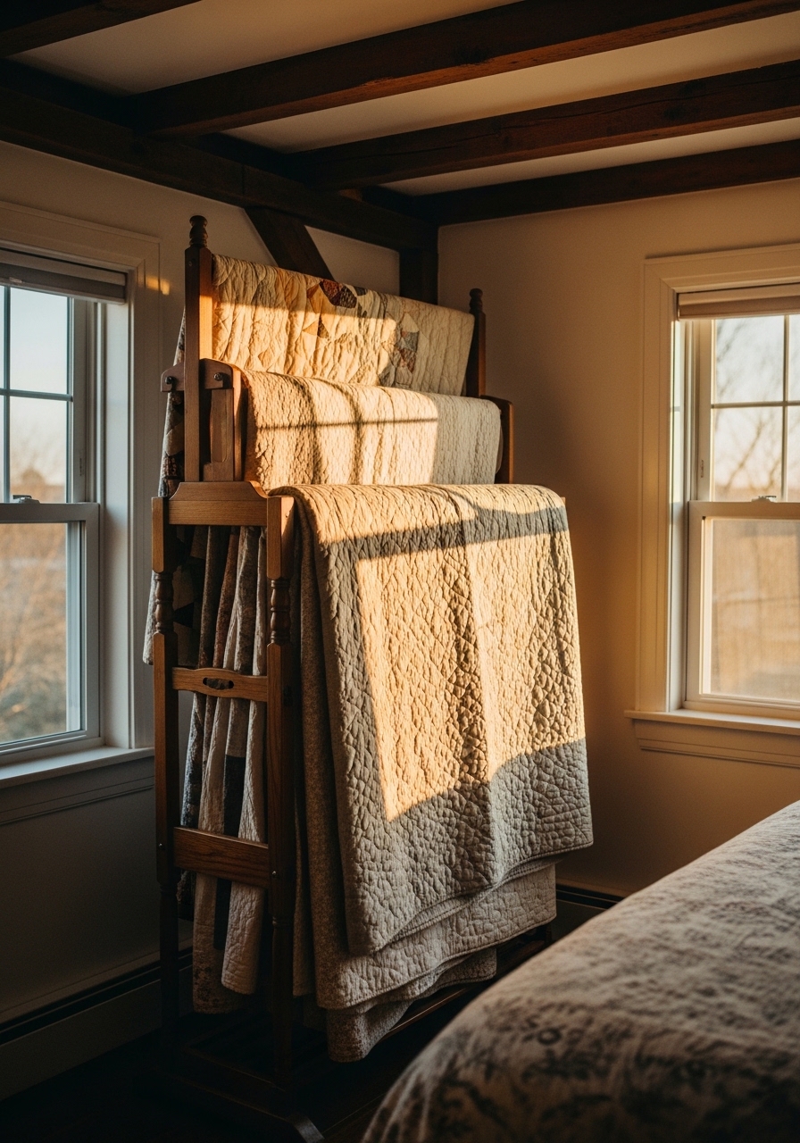 A standing quilt rack displays heirloom pieces, adding farmhouse heritage with boho layering. Fold them artfully for color pops. I inherited one from my grandma and it brings such cozy memories.