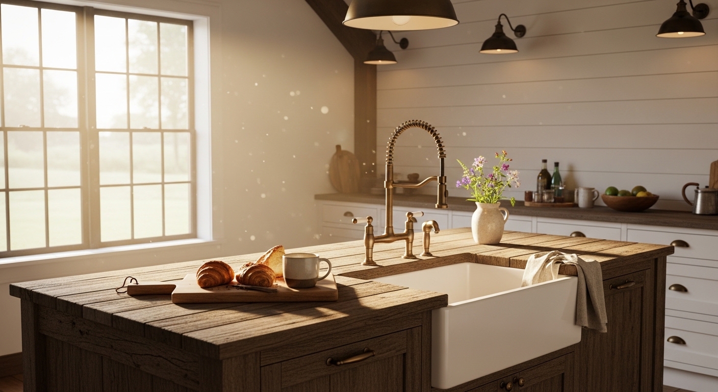 A kitchen with white cabinets and a wooden countertop covered in potted plants is pure boho magic. It brings life to the space while keeping farmhouse roots. I love how it makes meal prep feel more zen.