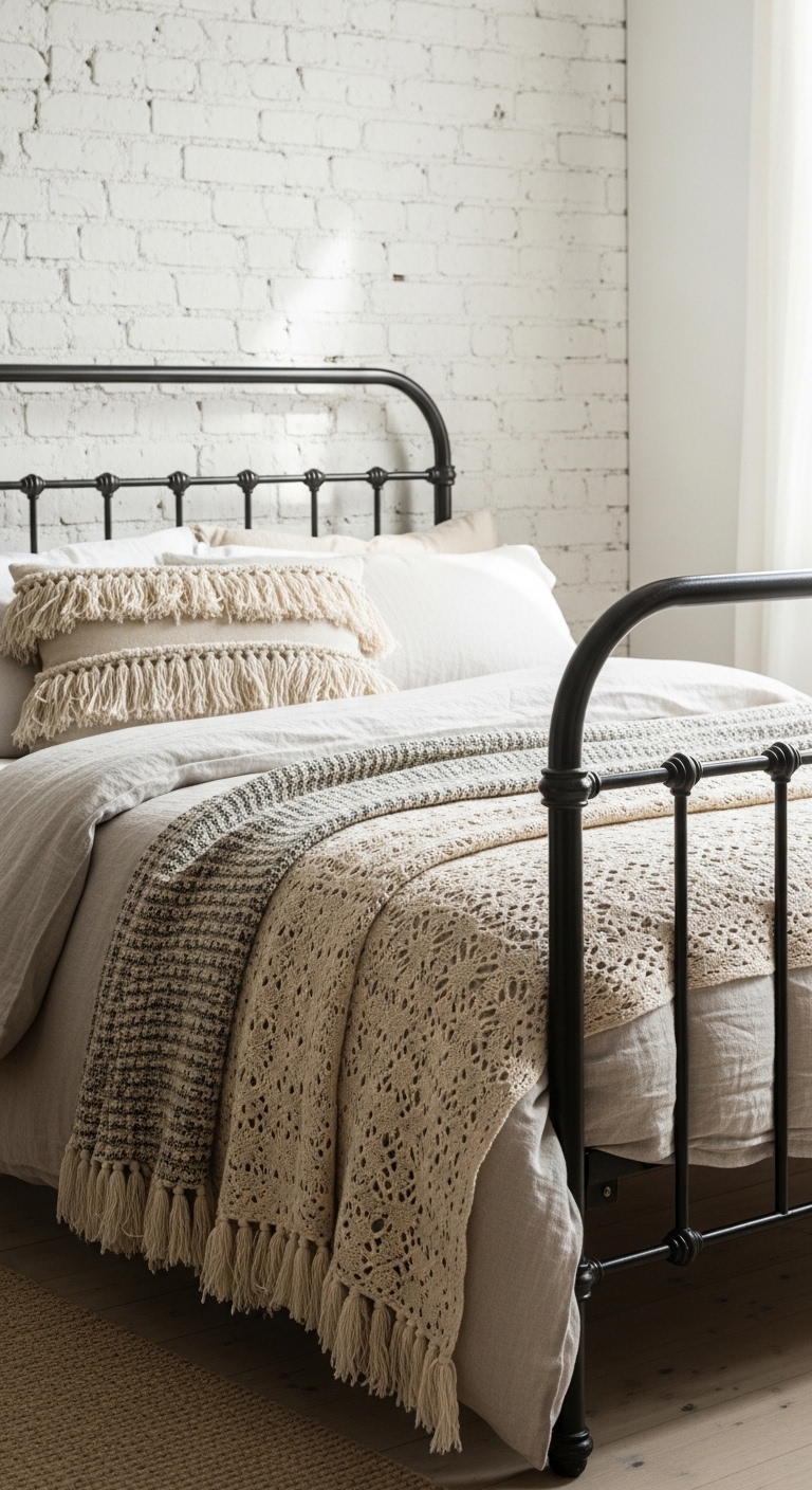 Layering textiles like quilts and throws brings that boho texture to a farmhouse bedroom without any pins covering this exact vibe. It’s all about mixing patterns for a cozy, eclectic feel. I did this in my guest room, and visitors always comment on how inviting it is. Start with neutrals and add pops of color for balance.