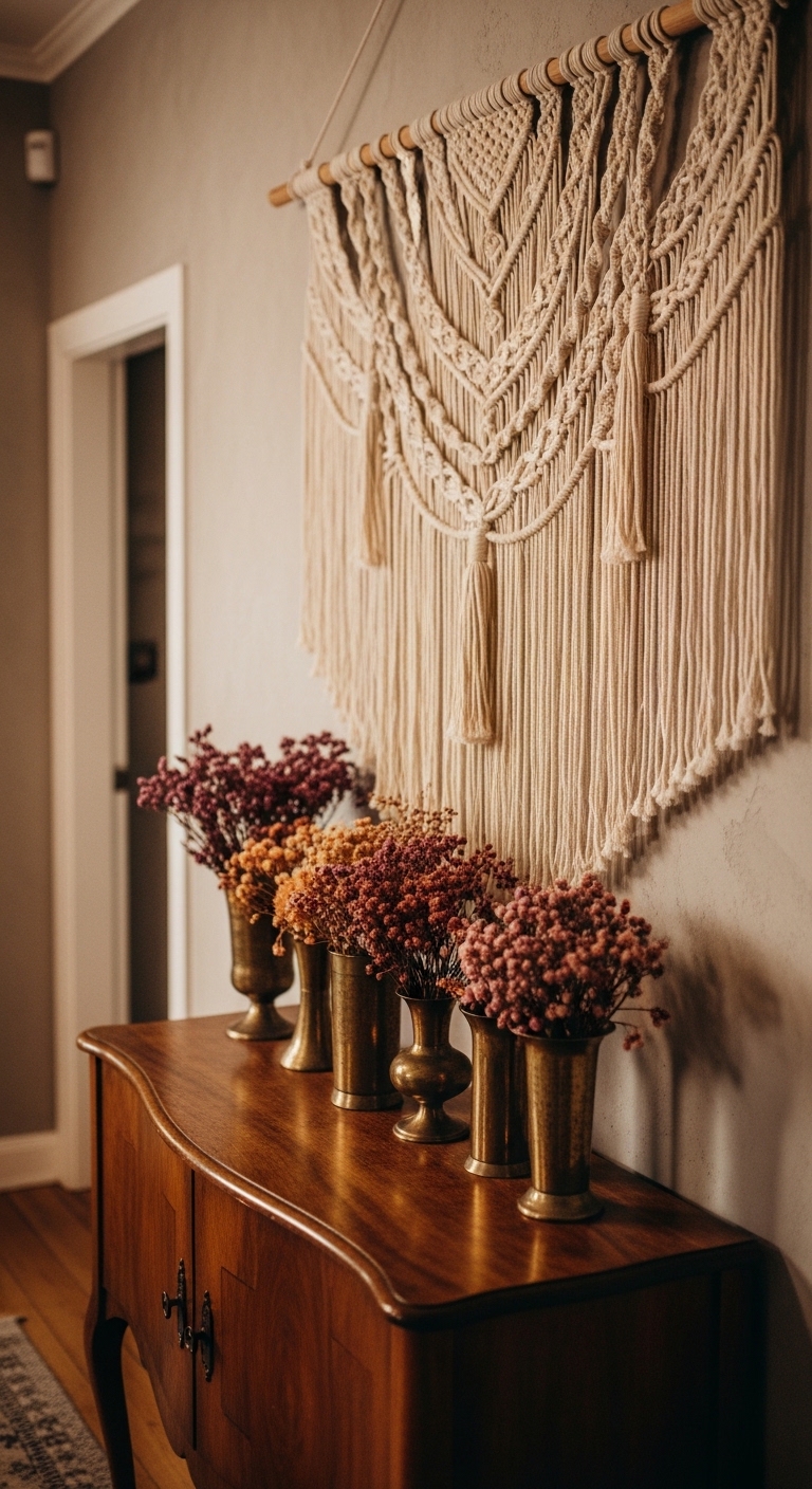 Adding a macrame wall hanging introduces that signature boho weave to farmhouse walls, something fresh beyond the plant shelves in the pins. It’s handmade charm that softens stark spaces. I knotted one myself last winter, and it hangs proudly in my dining nook. Pair with neutral tones to keep it grounded.