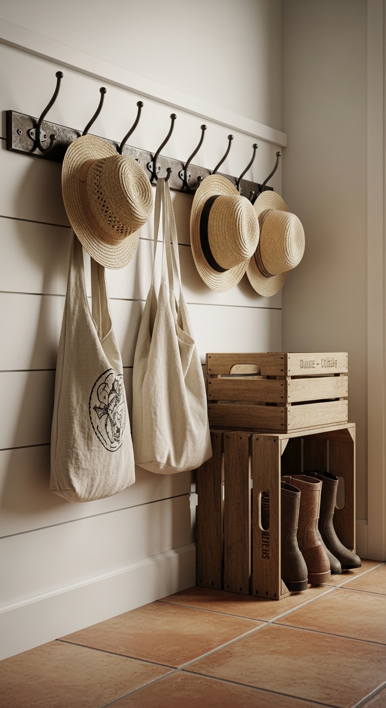 Creating an entryway mudroom with hooks and storage brings practical boho farmhouse to the front door, a fresh take not in the pins. It’s great for organizing without clutter. I installed mine last fall, and it keeps my home tidier. Add some dried lavender for a welcoming scent.