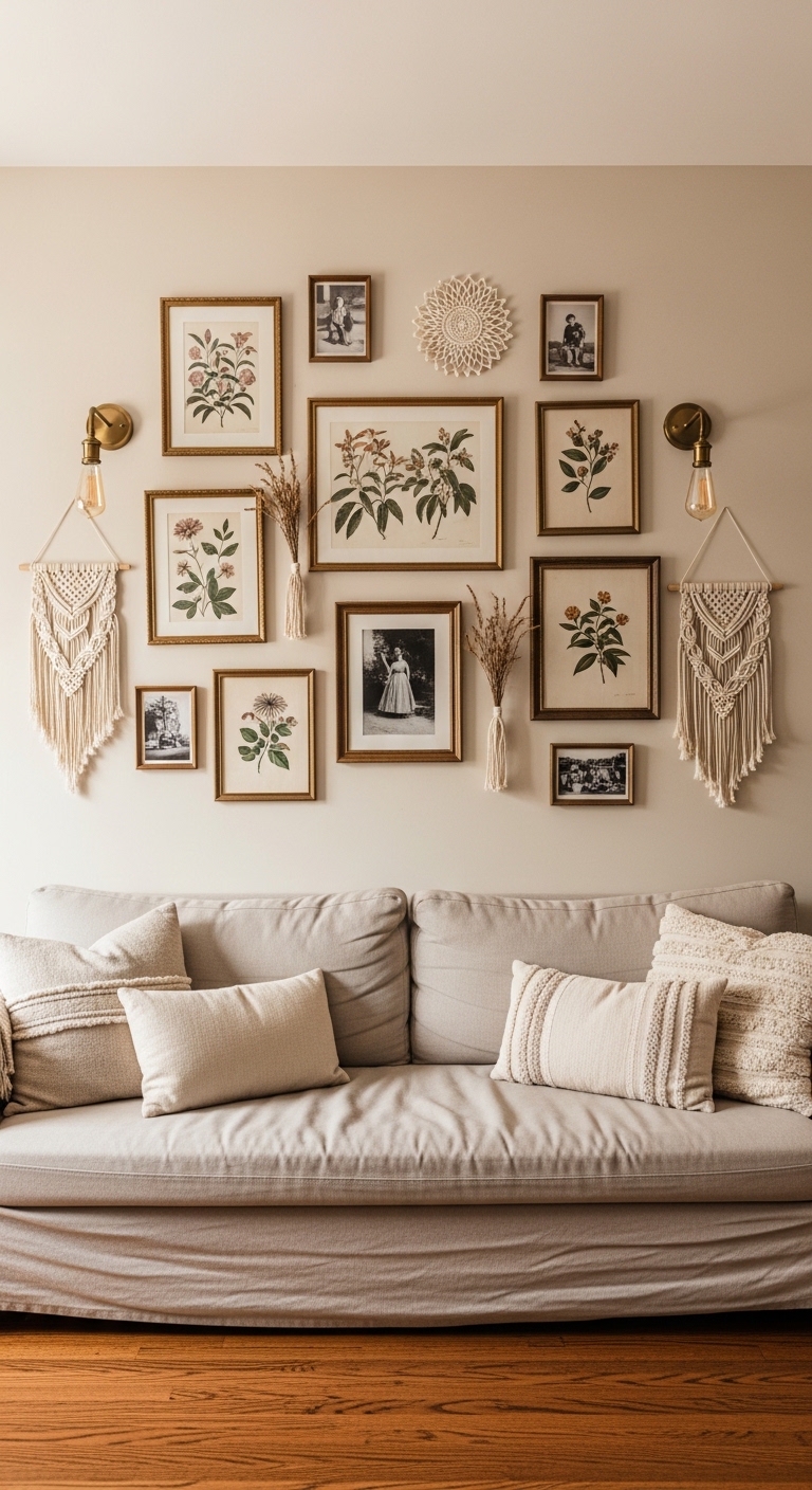 Curating a gallery wall with mixed frames brings artistic boho to farmhouse walls, distinct from the single picture setups in pins. It personalizes any room. I spent a weekend arranging mine, and it tells my family’s story. Use odd numbers for balance.