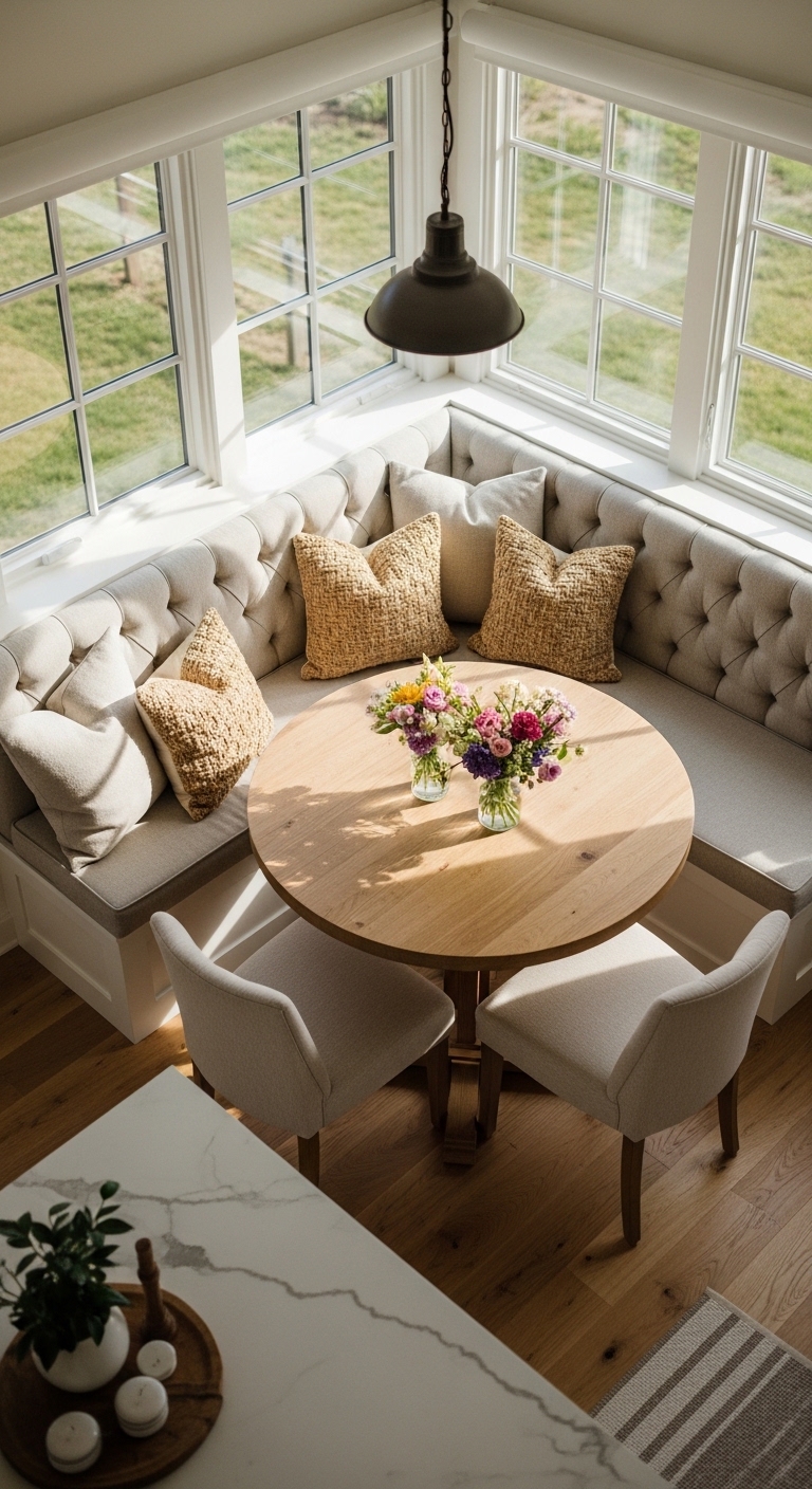 A dining nook banquette offers cozy seating for meals, a unique boho farmhouse twist not seen in the table pins. It saves space and encourages lingering. My friends love gathering here for coffee; I added storage underneath for practicality. Choose durable fabrics for everyday use.