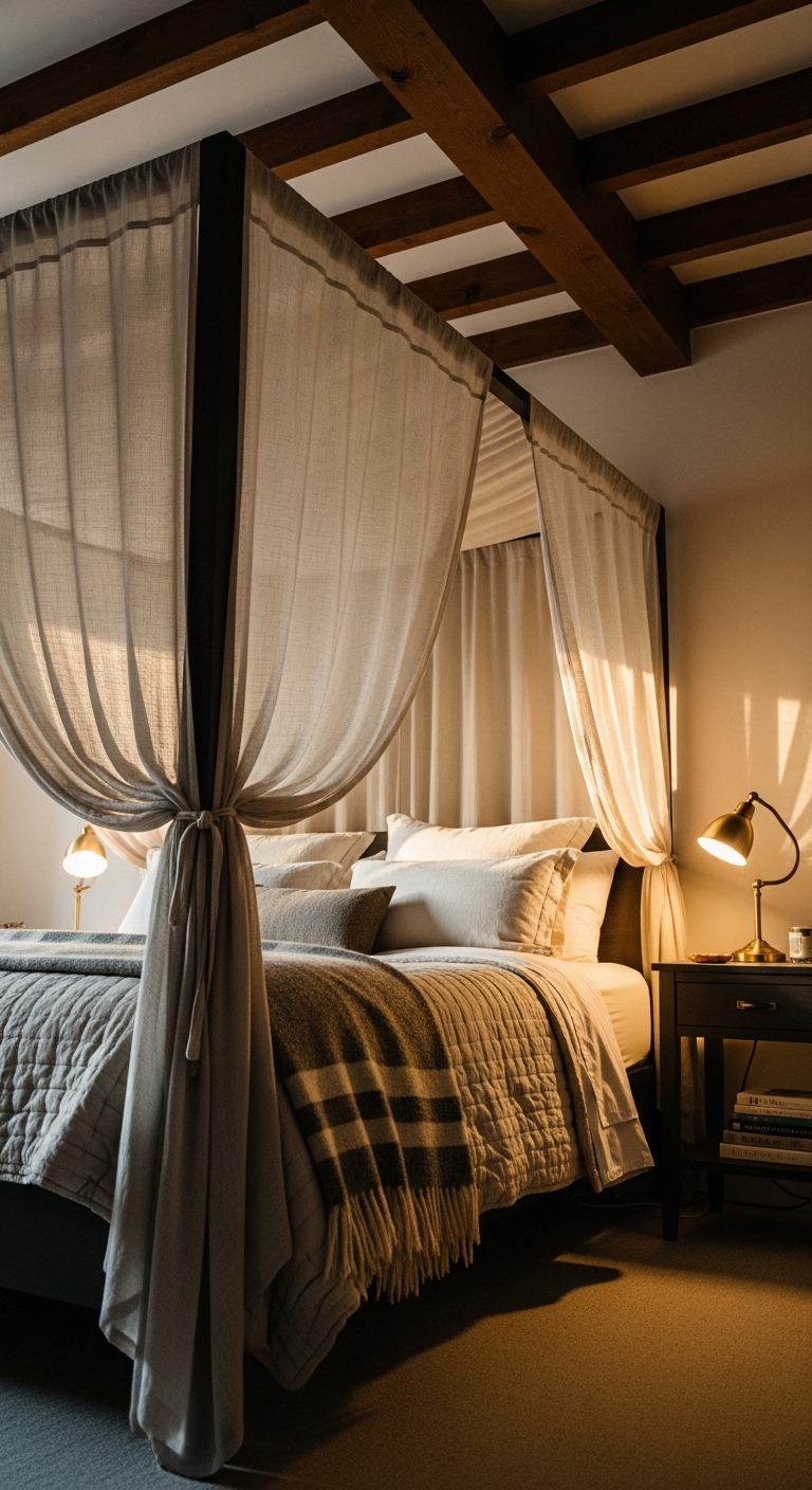 Incorporating a canopy bed frame adds romantic boho drama to farmhouse bedrooms, beyond the basic bed setups in pins. It’s like a private retreat. I dreamed of this forever and finally got one – sleep has never been better. Flowy fabrics enhance the ethereal feel.