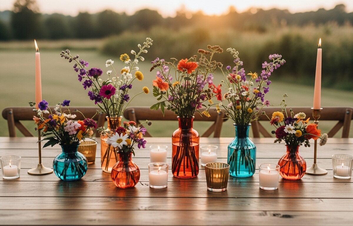 These mismatched colorful vases crammed with fresh blooms scream boho joy – just grab whatever’s at the market and cluster them on a wooden table. I did this for a picnic party once, and the way the colors popped against the sunset? Obsessed. It’s low-effort but feels like you planned it for weeks.