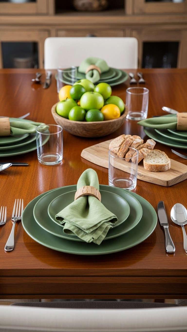 Set your table with green items for meals. Find budget plates or runners at clearance sales. Go for solid green hues. They make meals special. Layer with plain white dishes for contrast. This looks polished yet easy. For DIY ideas, dye white napkins green using fabric dye from the store. Do it in your kitchen sink. Total cost: about $15. Fold them neatly. Use for family dinners or parties. Store them for future events. Keep setups straightforward.
