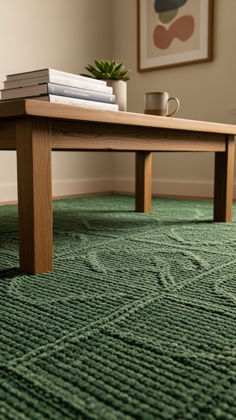 Roll out a green rug to cover your floors. Search for deals on smaller sizes. Select shades that stand out. Place it in high-traffic areas. It warms up the room instantly. For DIY flair, stencil patterns on an old rug using green fabric paint. Get paint for $5. Let it dry overnight. This gives a custom touch. Use it during holidays or year-round. Keep costs low and results high.
