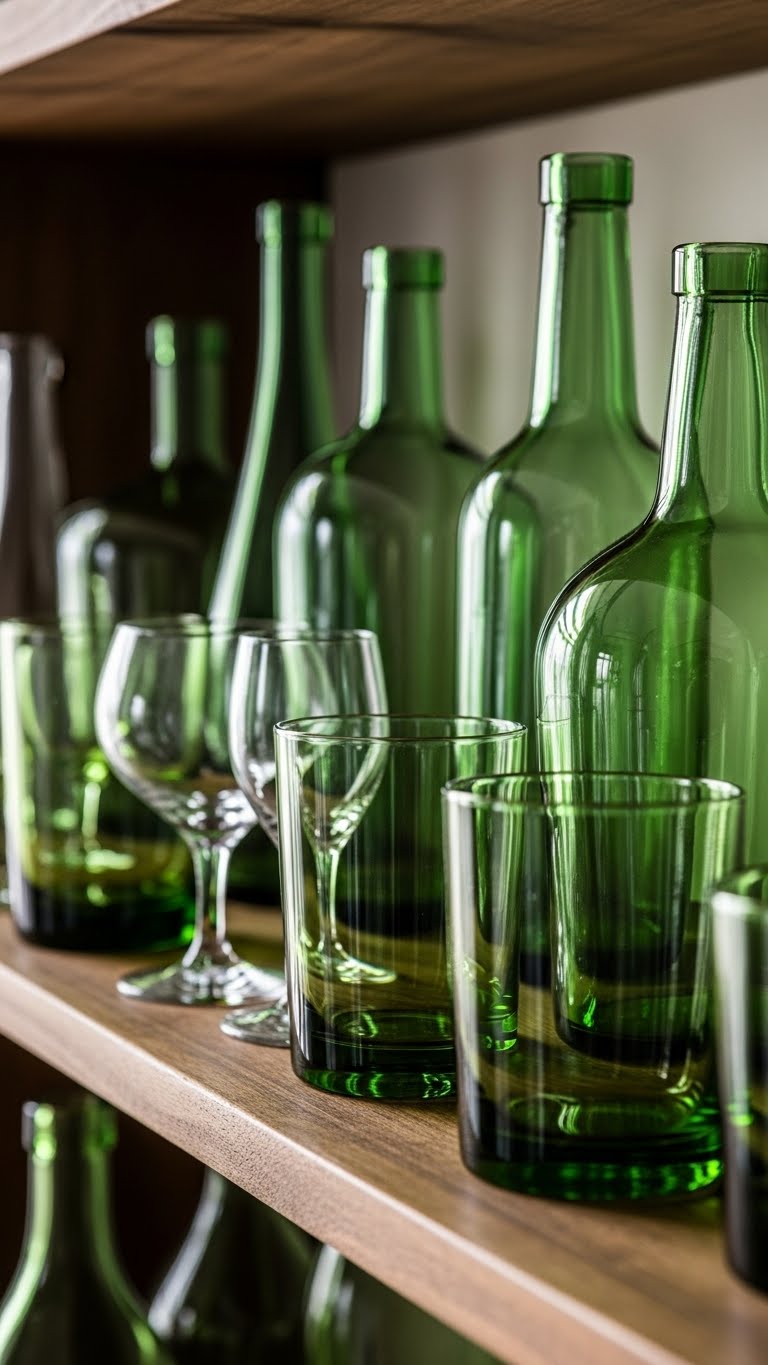 Fill your shelves with green glass items. Hunt for glasses at yard sales. Their color catches the eye. Display them on open shelves. It adds a festive vibe. For DIY options, wrap clear glasses in green tape from craft stores. Remove it later. Spend less than $8. Use for drinks or as decor. They brighten parties easily. Try this for quick updates.