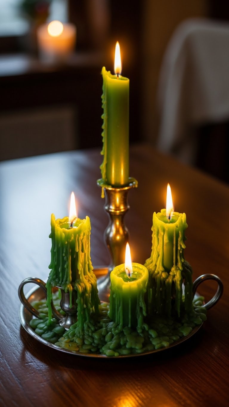Light up with green candles. Buy packs from discount aisles. Their color sets a mood. Place them on tables or mantels. Light for evenings. For DIY fun, color white candles with green markers. Do it in minutes. Cost: under $5. They create a cozy feel. Use safely and store away. Perfect for gatherings.