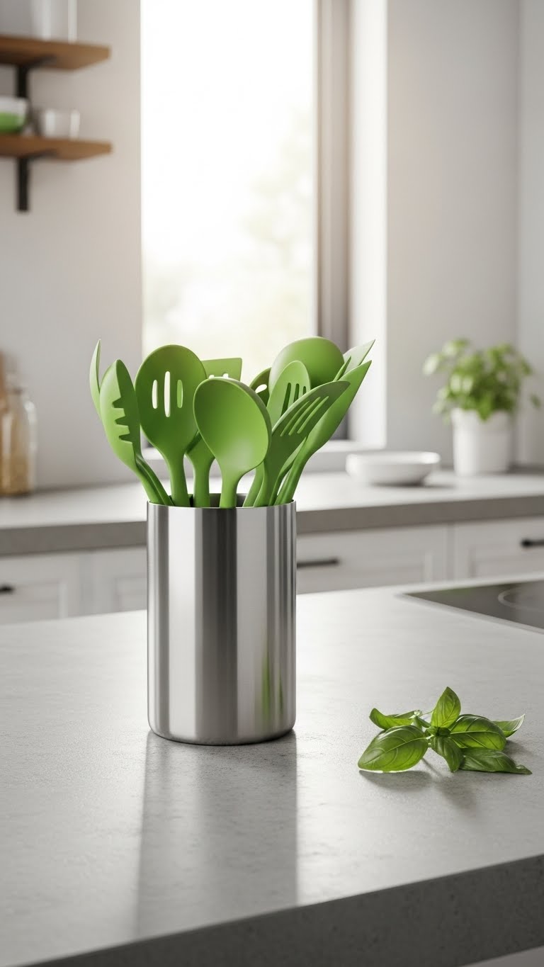Outfit your kitchen with green tools. Find sets at sales. Their color pops. Keep them in holders. It freshens the space. For DIY, wrap handles with green tape. Do it quickly. Cost: $4. Use for cooking or display. Simple and practical.