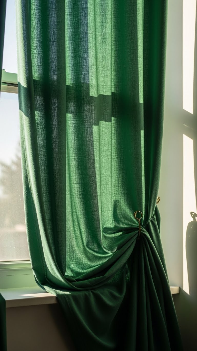 Hang green curtains for windows. Search for affordable panels. Select light shades. They soften rooms. Install with basic rods. For DIY, sew hems on green fabric pieces. Use a needle and thread. Price: around $9. They control light well. Change with seasons.