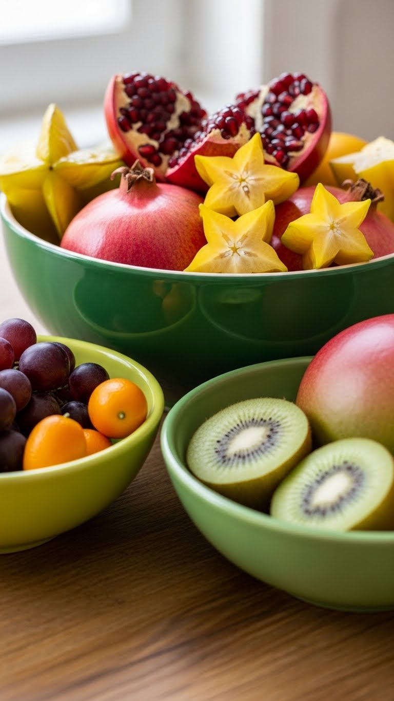 Center tables with green bowls. Buy from kitchen stores. Fill with fruits or decor. Their color draws attention. Place in key spots. For DIY, paint inside of clear bowls green. Dry fully. Cost: $5. They add utility and style.