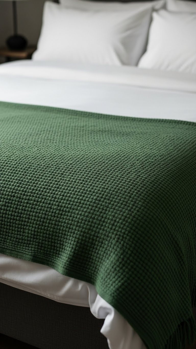 Top beds with green throws. Get from budget lines. Choose cozy fabrics. Drape over ends. It invites rest. For DIY, knit a small throw with green yarn. Use hooks. Spend $12. Enjoy the warmth. Fits any bedroom.