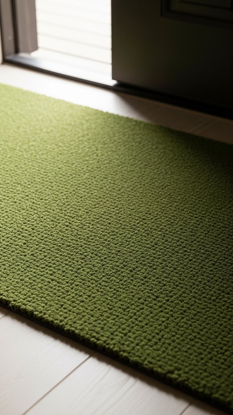 Lay green mats at doors. Pick durable ones online. Their color welcomes guests. Wipe feet on them. For DIY, stencil designs on mats with green paint. Let dry. Price: $7. They protect floors too.