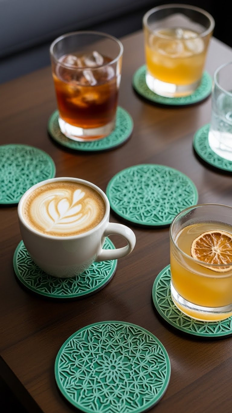 Set out green coasters. Buy packs cheaply. Their color protects surfaces. Stack near seating. For DIY, cut green felt into circles. Edge with tape. Spend $3. They prevent marks easily.