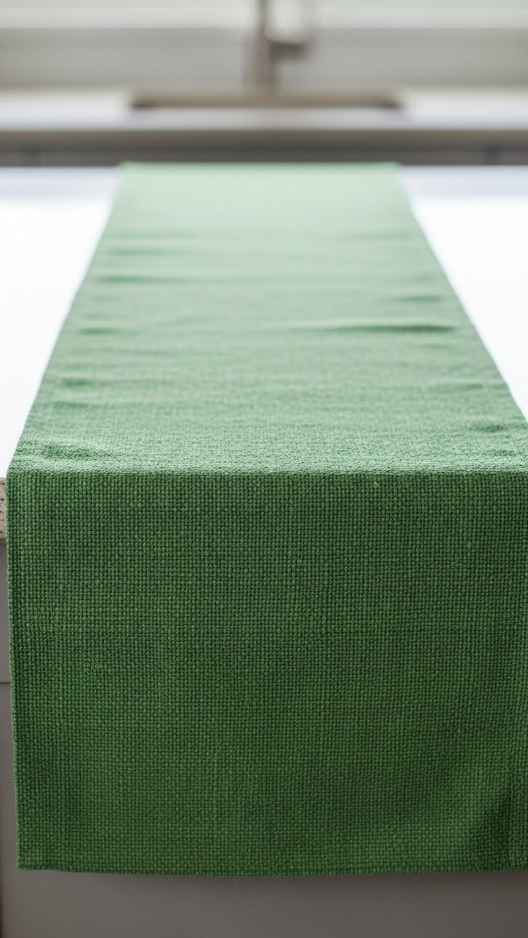 Line counters with green runners. Get fabric rolls. Cut to size. They add color. For DIY, hem green cloth pieces. Use scissors. Cost: $4. Keep counters neat.