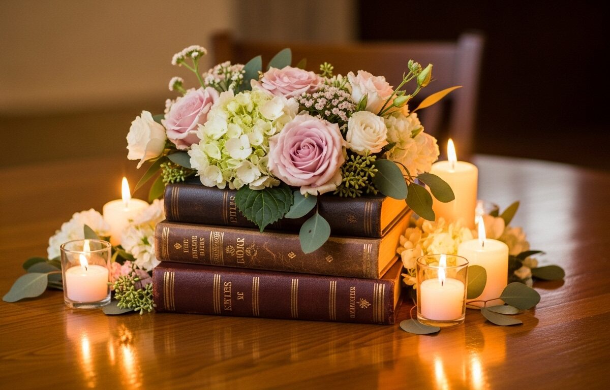 Okay, real talk – start by raiding your own shelves for books that match your party’s color scheme, like neutrals for elegance or bright spines for fun pops. Layer them with low vases or jars of in-season flowers so convo flows easy across the table, and always add candles or fairy lights for that warm glow – trust me, it transforms everything. If you’re DIY-ing, secure stacks with hot glue dots under ribbons to avoid topples mid-party; I learned that the hard way at my first try. Scale to your table size – bigger spreads need multiples, but don’t overcrowd or it’ll feel chaotic.