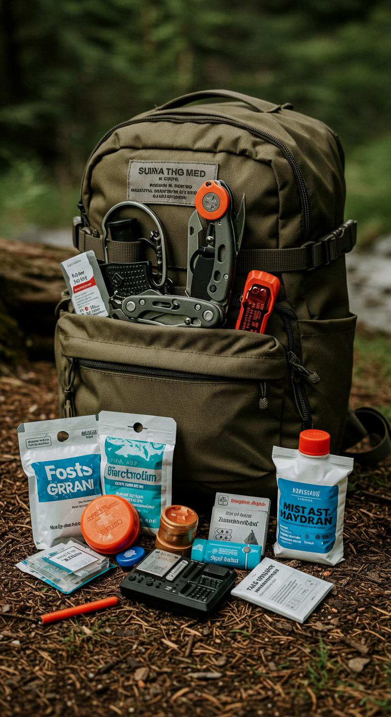 This kit should include essential survival gear like a multi-tool, first aid supplies, and emergency essentials like a fire starter and water purification tablets.