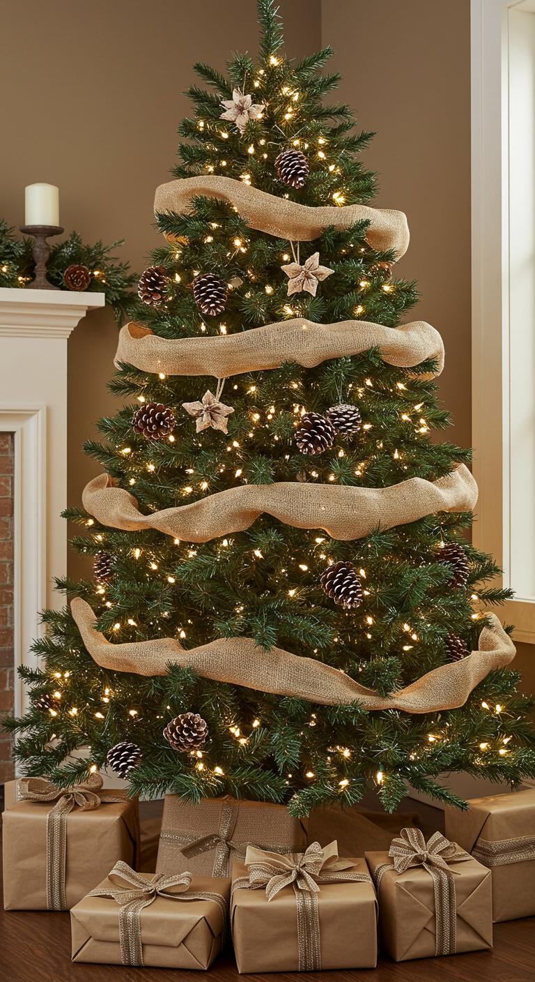 When you think of rustic elegance, imagine a warm, inviting Christmas tree adorned with the natural beauty of pinecones and the earthy charm of burlap.