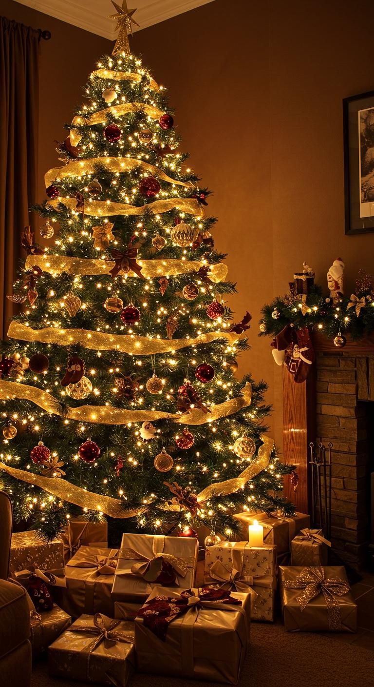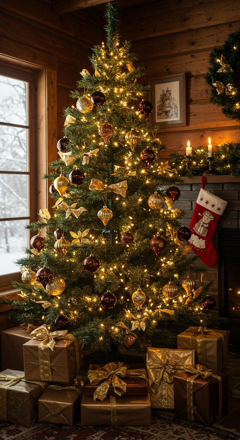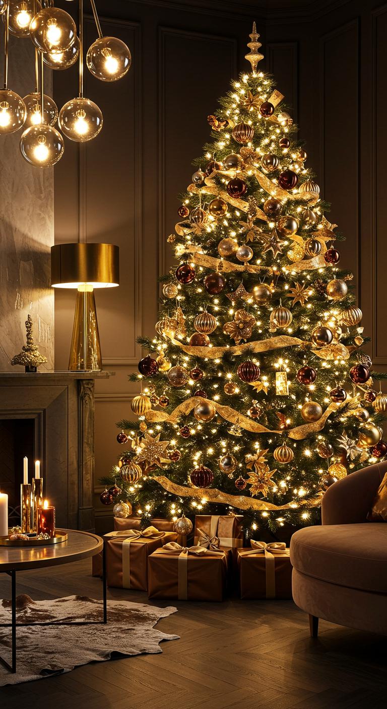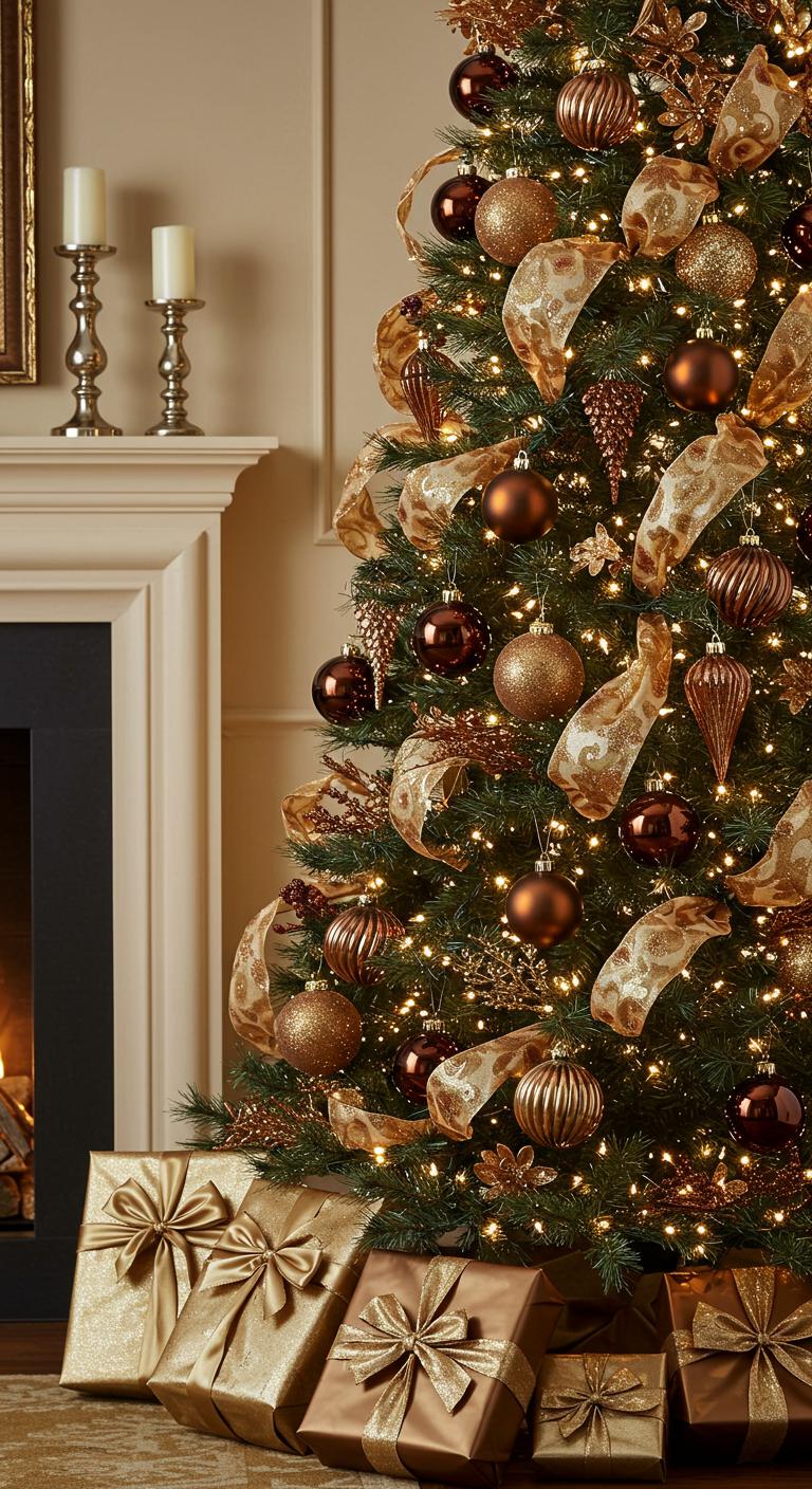 Imagine shimmering gold ribbons cascading down, reflecting twinkling lights, while deep chocolate and earthy tones of the ornaments create an inviting backdrop.