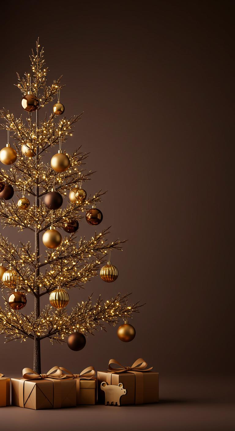 Picture a minimalist tree adorned with delicate gold ornaments, interspersed with rich brown accents.