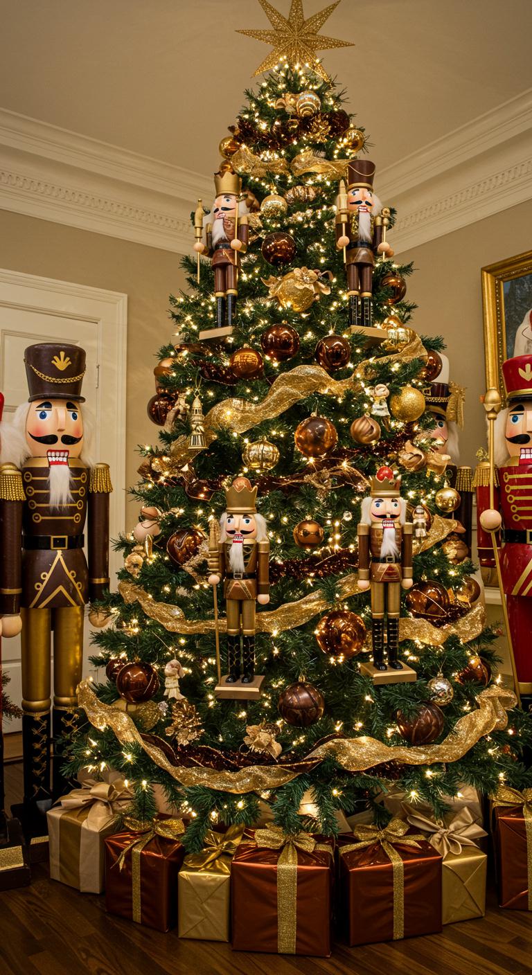 Drape garlands of rich gold and deep brown, while festive nutcracker costumes add a playful touch, creating a warm, inviting atmosphere that celebrates the magic of the season.