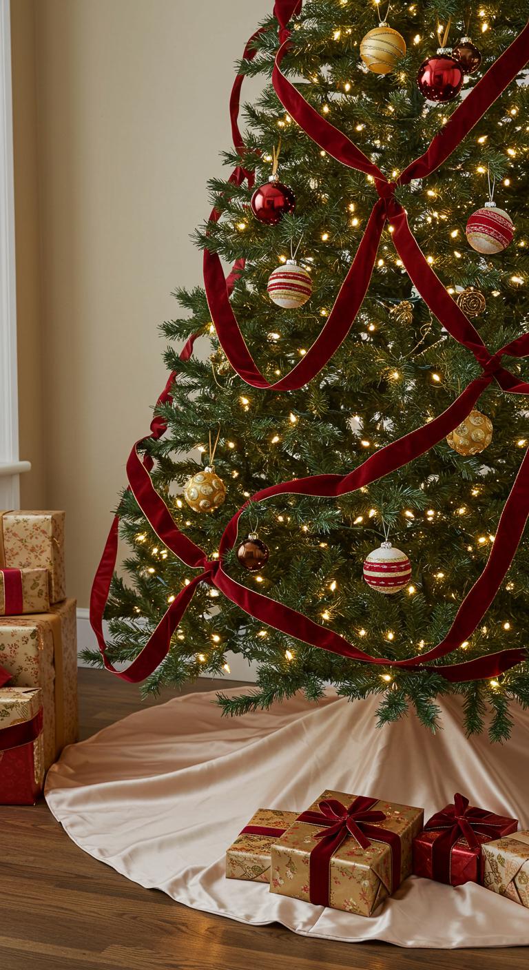 Adorn your tree with rich velvet ribbons cascading down its branches, while a sumptuous satin tree skirt elegantly frames the base, creating a stunning visual that invites warmth and celebration into your home.