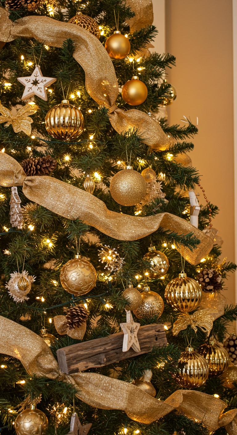 Imagine a Christmas tree that perfectly balances glamour and rustic charm, where sparkling gold glitter dances amid the warm hues of natural wood.