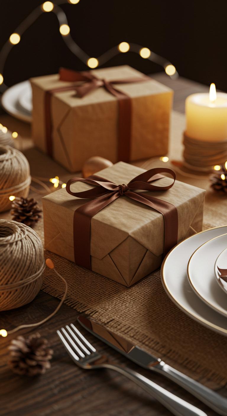 This creative gift wrapping not only enhances the presents but also complements your rustic table settings. Add twine or burlap accents for a personal touch, transforming each gift into a delightful centerpiece that embodies the warmth of the season.