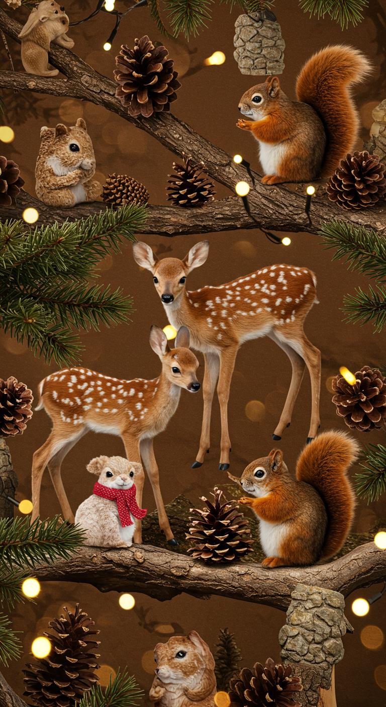 Picture charming woodland critters nestled among pinecones and twinkling lights, while rich brown and gold hues enhance natural textures.