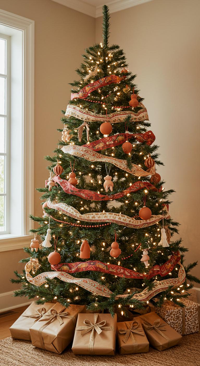 Adorn your tree with rich bohemian textiles, like woven ribbons and fabric garlands, while earthy ornaments—think wooden figures and terracotta accents—bring a touch of nature indoors.