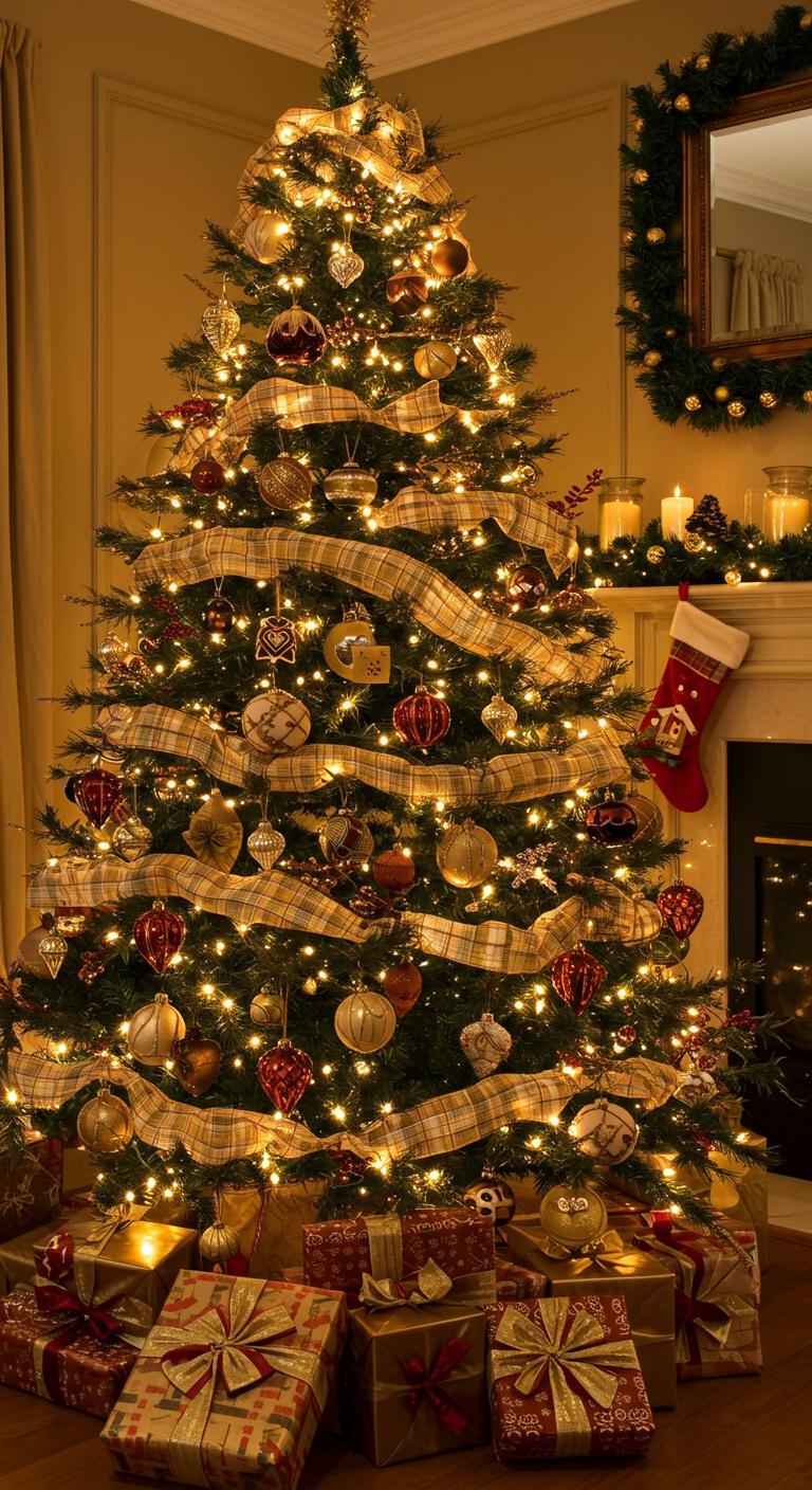 Imagine the warmth of brown tartan patterns draping your tree, complemented by holiday plaid accents. The cozy hues evoke nostalgia, creating a serene backdrop for cherished ornaments, twinkling lights, and moments filled with laughter and joy.