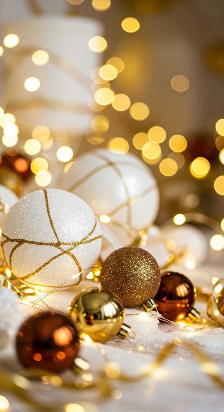 Picture soft white lights illuminating elegant textures, while gold accents shimmer against the backdrop. Brown ornaments offer warmth, grounding the aesthetic.