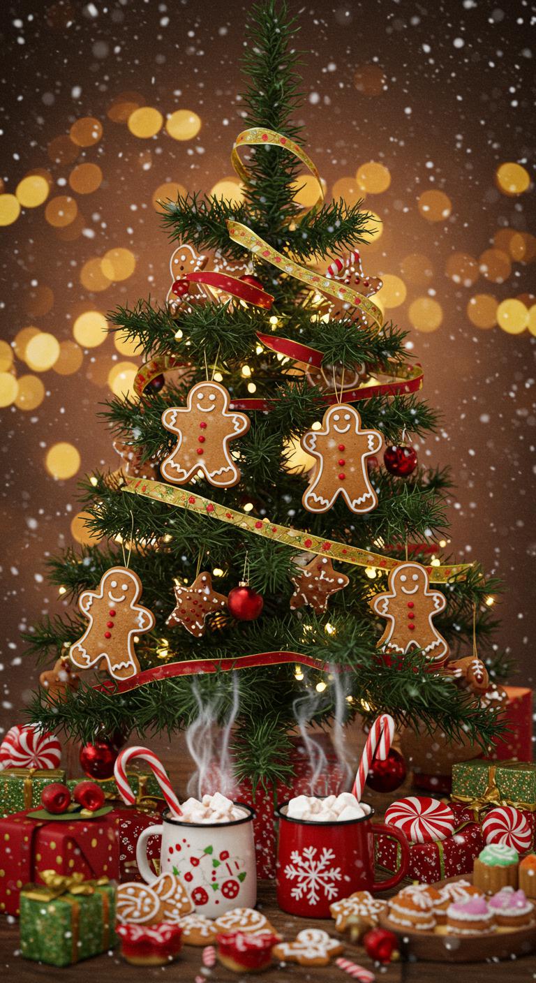 Your tree sparkles with ornaments shaped like gingerbread cookies, while whimsical ribbons swirl around branches.