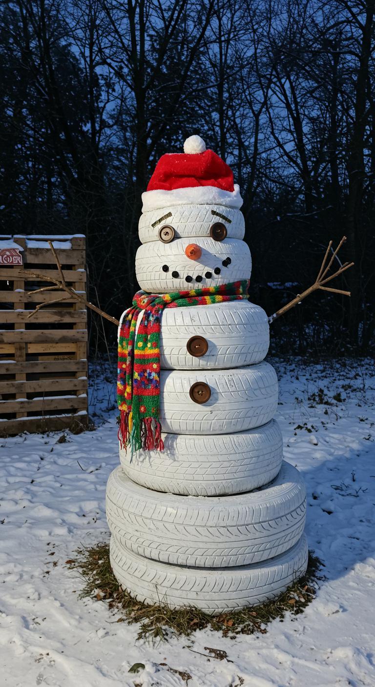 After enjoying the warm glow of your pallet tree, try something playful and sturdy for another outdoor spot: an upcycled tire snowman.