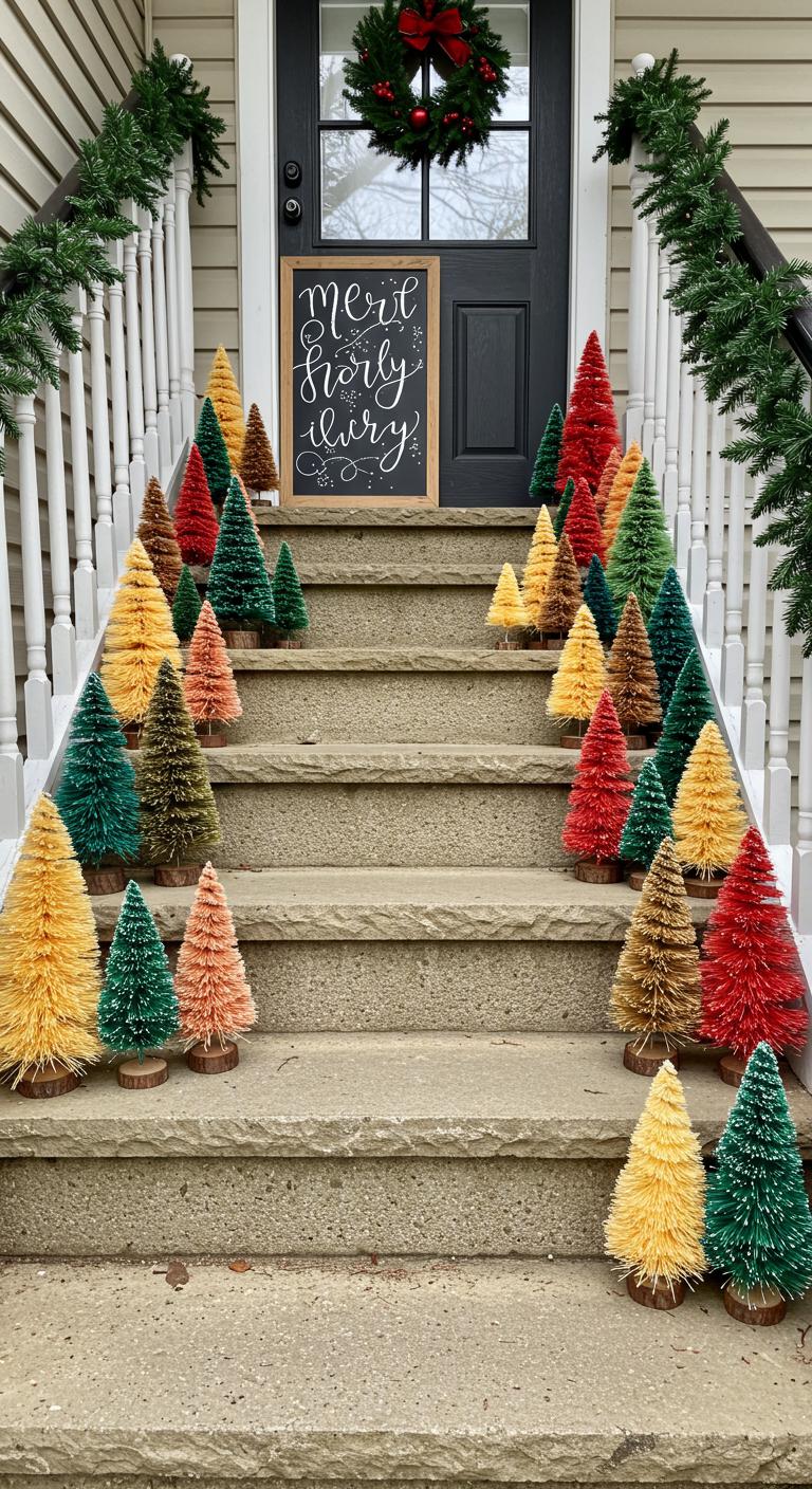 If you loved the cozy chalkboard greeting, carry that same warm welcome down the steps with a cluster of bottle brush trees—they’re inexpensive, lightweight, and make a big visual impact when grouped by size and color. Arrange them on staggered risers, anchor with hidden weights, and mix textures and festive colors. You’ll create a bold, carefree entry that’s simple to swap each season.
