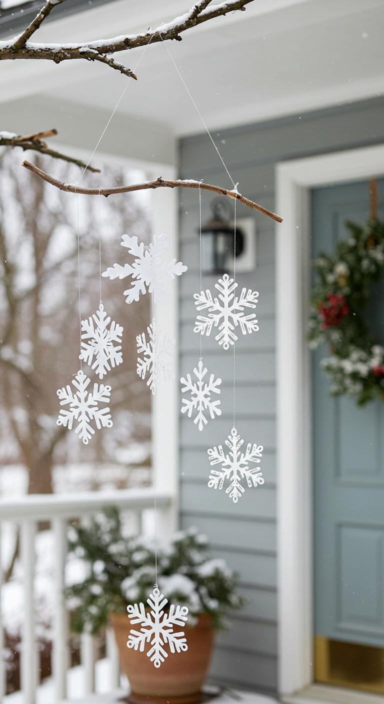 As the air turns crisp, hang a simple snowflake branch mobile to add whimsy and movement to your porch or entryway—you’ll get a wintry focal point without spending much.