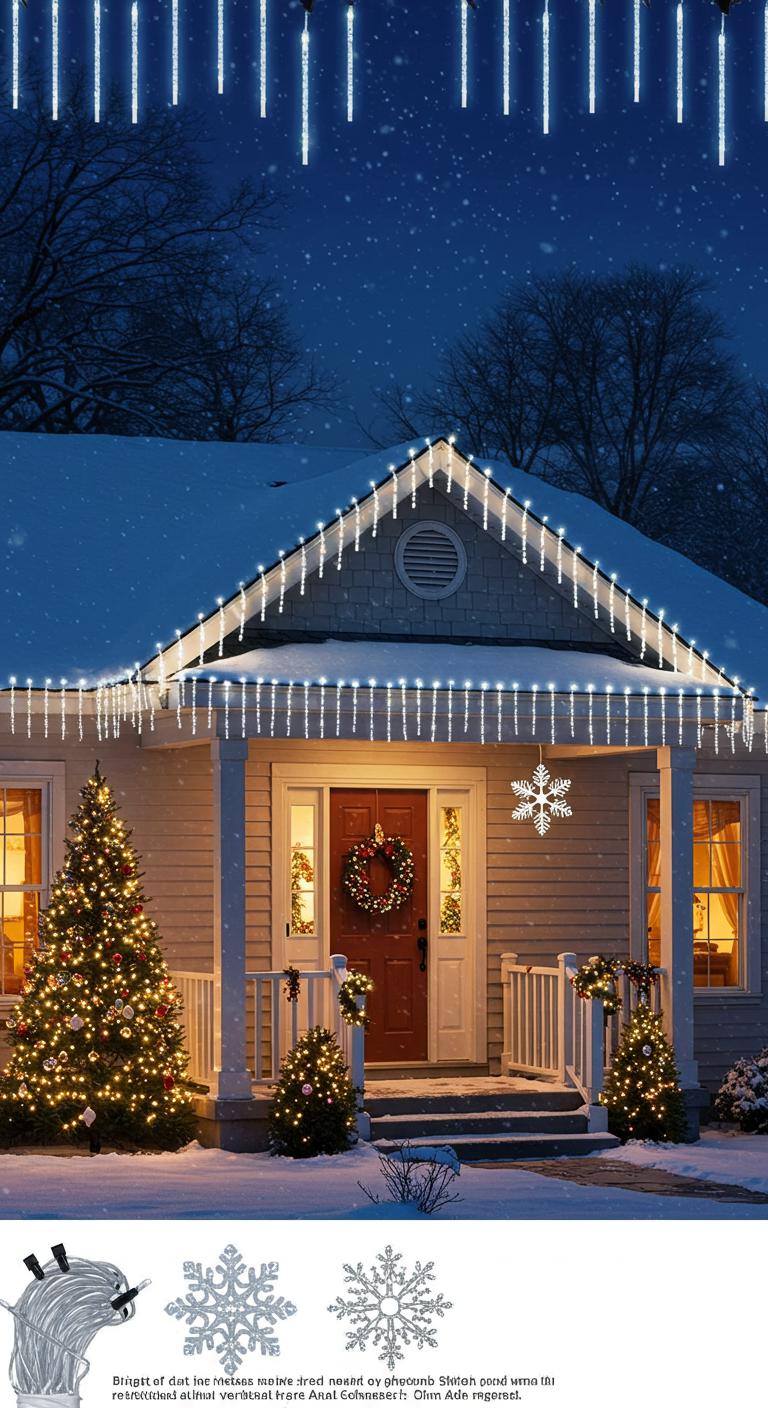 You’ll plan led icicle installation for even drops, secure clips to avoid damage, and choose cool-white strands.