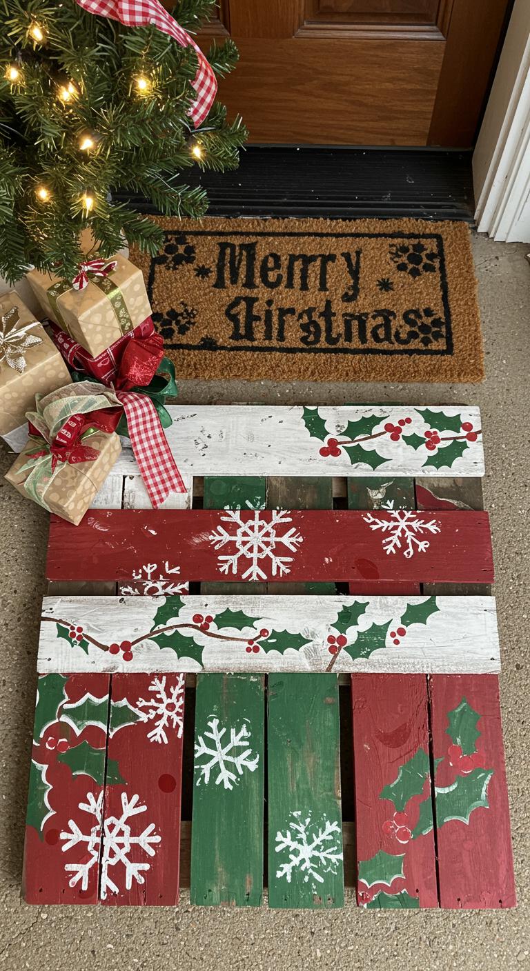 You paint slats in festive colors, arrange and secure them, then apply stenciled designs—snowflakes, holly, or a bold welcome—using weatherproof paint.
