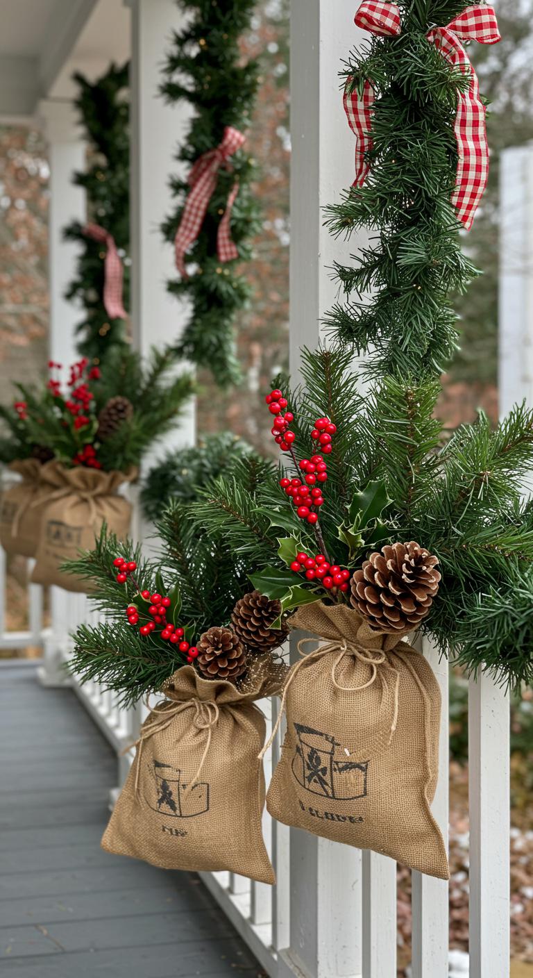 Think of rustic burlap sacks as instant holiday bouquets for your porch railings — you’ll fill, tie, and hang them in minutes to create warm, budget-friendly charm.