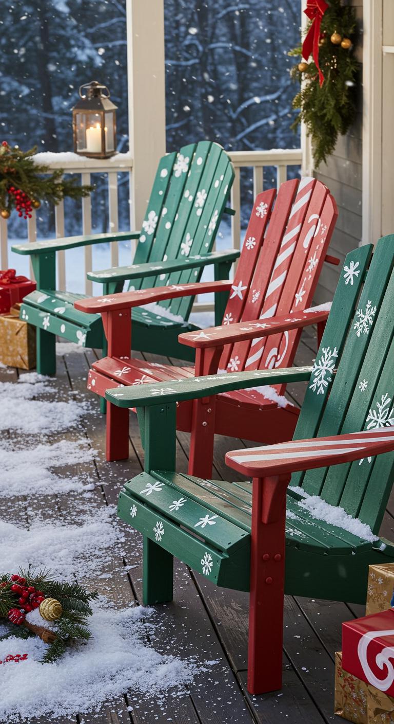 Bring a splash of holiday cheer to your porch by painting Adirondack chairs with simple, bold motifs—stripes, snowflakes, candy canes, or evergreen silhouettes—and you’ll get a festive, custom look without spending a lot.