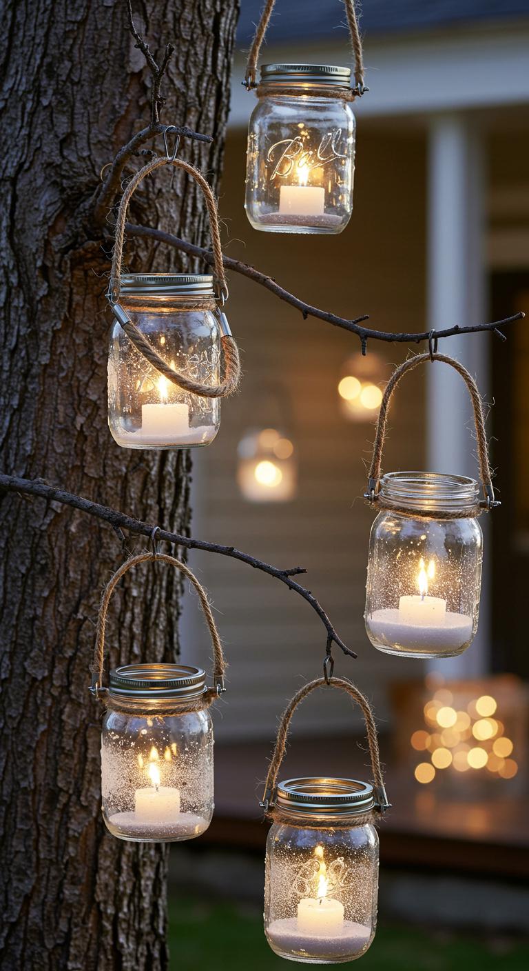 When you line your porch or hang them from tree branches, mason jar lanterns with battery tea lights turn ordinary glass into warm, flickering holiday charm that’s safe and easy to manage.